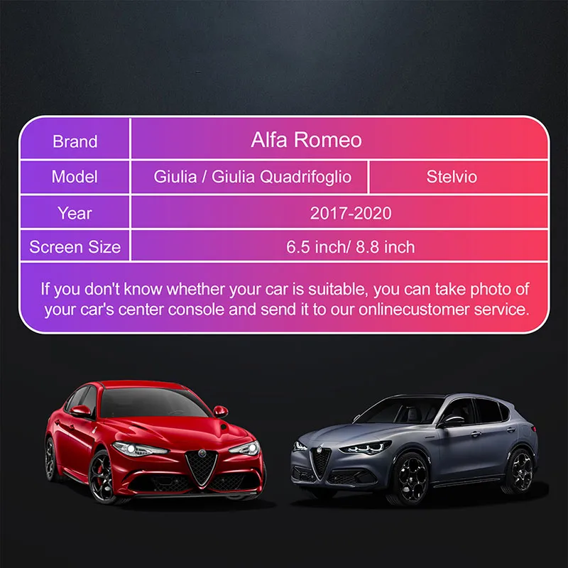 Αναβαθμίστε την Alfa Romeo σαςΑναβαθμίστε την Alfa Romeo σας 2017-2020 με οθόνη 6.5 & 8″ και απολαύστε ασύρματο CarPlay και έξυπνες λειτουργίες Upgrade Your Alfa RomeoUpgrade Your 2017-2020 Alfa Romeo with 6.5″ & 8″ Screen and Enjoy Wireless CarPlay and Smart Features |